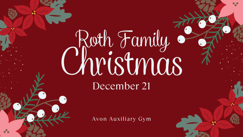 Although we may have outgrown Grandpa & Grandma Roth’s basement, let’s resurrect some moments of Roth Christmas past. Join us December 21 at the Avon Auxiliary Gym. We’ll be playing some old home movie footage, courtesy of Robert. Carol is organizing some games. And Santa will also pay a visit at some point in the night (<< Attention parents)!! The gift exchange will be White Elephant. Keep kids’ gifts separated so they have age-appropriate options to pick from.